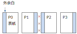 結果として 表紙の次のページは2ページ目ですがマイナス1によりP1と表示されます。(以降同様)そのため綴じしろも変更されます。 |