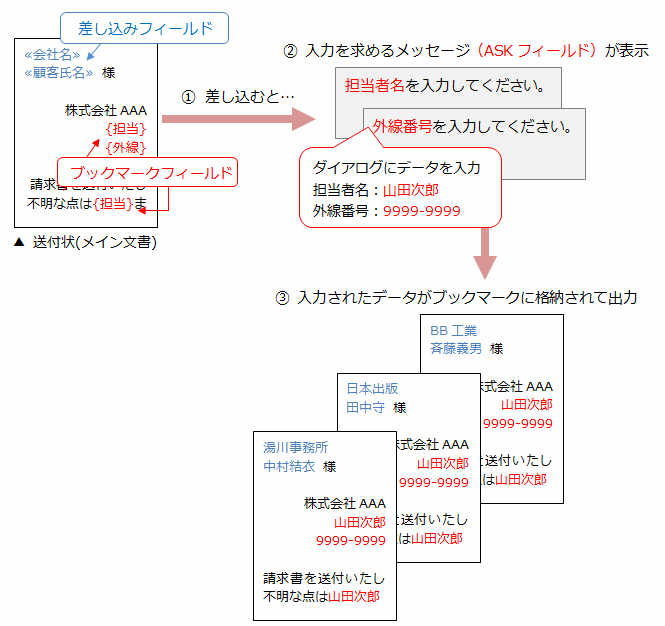 ASKフィールドはメイン文書にデータを差し込む時に入力を求めるメッセージを表示し、入力された値をブックマークに格納するフィールドです。そのブックマークをメイン文書に挿入しておけば一括して入力されたデータを差し込むことができます。(似た動作をするFILLINフィールドはこちら)