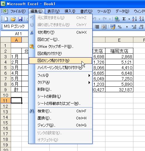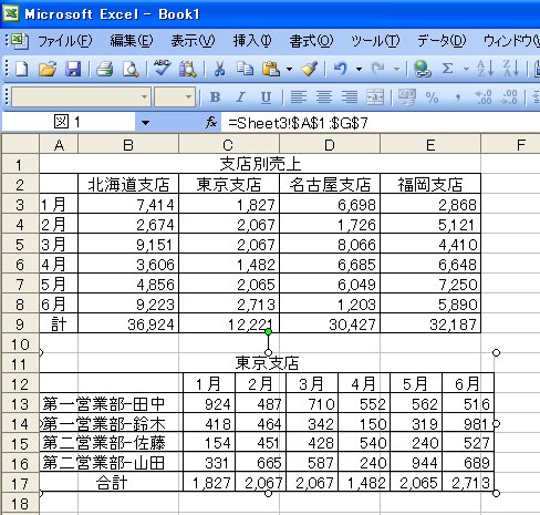 [図のリンク貼り付け]を実行すると、コピーした「東京支店」がリンクされた図として貼り付きます。