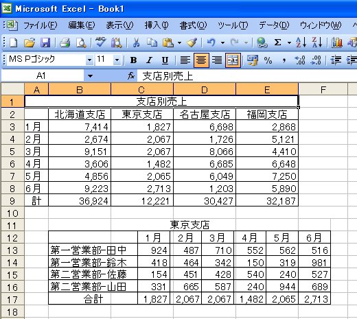 ここでは、Sheet2の「東京支店」を、Sheet1の「支店別売上」の下に表示する手順を解説します。