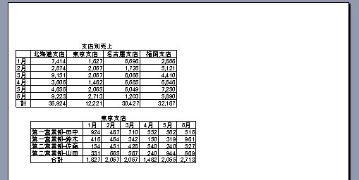 見て明らかなように、この2つの表は列の幅が異なっています。それぞれの表に適した列幅ですから、異なって当然ですね。こうした列幅の異なる複数の表を1枚の用紙に印刷しようとすると、さて困ってしまいます。こんなときは、