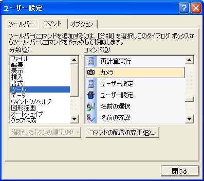 [表示]メニューの[ツールバー]をポイントし[ユーザー設定]をクリックします。表示される[ユーザー設定]ダイアログボックスの[コマンド]タブを開き、[分類]リストで「ツール」を選択します。