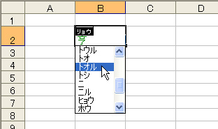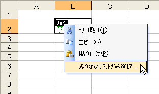 この操作では、セルに入力されている漢字から読みを判断して、Excelが自動的にふりがなを登録してくれます。Excelって賢いですね。でも、日本語には同音異義語がありますから、ときには異なる読みが登録されるかもしれません。そんなときは次のようにしてふりがなを選択します。