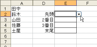 図のように、5人の名前を入力しておき、この名前をリストで選択します。リストを使って、5人の中から4人を選ぶわけですが、すでに「山田」が選ばれているときは、それ以降のリストに「山田」を表示したくありません。すでに選んだ名前は以降のリストから消したいんです。下の図のように。
