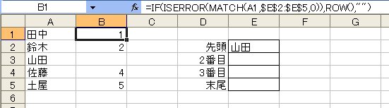 は「1」を返します。セル範囲E2:E5に「山田」が入力されていないときはエラーになります。ここでは「入力されていなかったらリストに表示」したいのですから、MATCH関数がエラーかどうかを判定します。そうISERROR関数です。