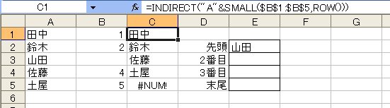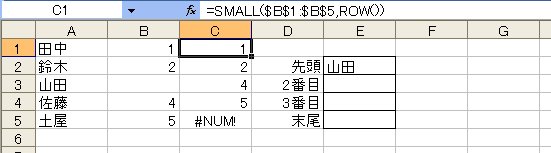 数字を小さい順に取り出すのはSMALL関数です。セル範囲C1:C5に次のような式を入力してみましょう。