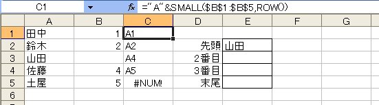 どの名前を表示するかというと、A列の「1行目」「2行目」「4行目」「5行目」にあるセルです。アドレスでいえば「A1」「A2」「A4」「A5」になりますね。ここで注目したいのは、「1行目」の「1」はセル範囲B1:B5内で「1番小さい数字」ということです。同様に「2行目」の「2」は「2番目に小さい数字」、「4行目」の「4」は「3番目に小さい数字」、「5行目」の「5」は「4番目に小さい数字」です。わかりますか?この理屈こそが今回行う処理で最大のポイントになります。