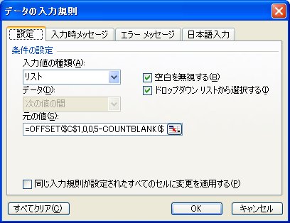 で、この式をどこで使うかというと、入力規則でリストに表示するセル範囲を指定する「元の値」ボックスです。セル範囲E2:E5を選択して[データ]-[入力規則]を実行します。表示される[データの入力規則]ダイアログボックスの[設定]タブで、[入力値の種類]→「リスト」を選択し、[元の値]ボックスに上記の式「=OFFSET($C$1,0,0,5-COUNTBLANK($C$1:$C$5),1)」を入力します。[OK]ボタンをクリックすれば完成です。