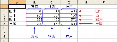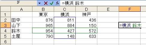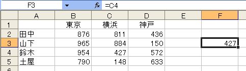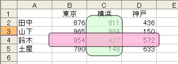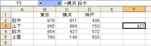セルC4は、名前「横浜」と名前「鈴木」が交差するセルですから、「=横浜 鈴木」という式で参照できます。