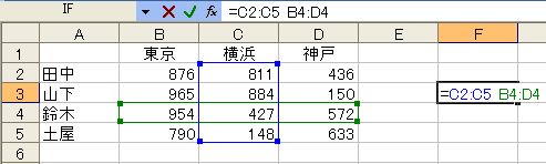 半角スペースでつなげます。下の図はセルF3に「=C2:C5 B4:D4」という式を入力しました。C2:C5とB4:D4の間に半角スペースを1つ入力してあります。