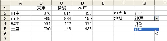ワークシート上でリスト入力(入力規則のリストを使う)」をご覧ください。同じように、セルG3には「東京,横浜,神戸」をリストから選択できるようにしました。