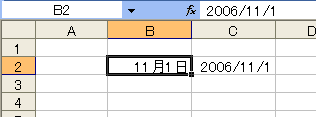 まずセルB2を選択して[セルの書式設定]ダイアログボックスを開き、先と同じ手順で「○月○日」形式に設定します。