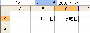 これで別のセルに曜日だけを表示できました。しかし、B列の日付とC列の曜日は連動していません。別のセルに、別の日付を入れているからです。これでは不便です。B列の日付を変更したときC列の曜日も自動的に変更されるようにするには、C列に