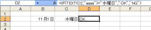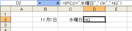 セルに曜日を表示するには上のように考えればいいのですが、では表示されている曜日を判定するにはどうしたらいいでしょう。たとえば、セルC2が「水曜日」だったら「OK」そうでなかったら「NG」と表示するようなケースを考えてみましょう。隣のセルD2に「=IF(C2="水曜日","OK","NG")」という数式を入力しました。