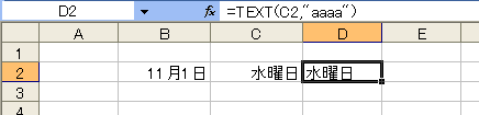 表示形式で「水曜日」という文字列を表示しているのに対し、D列は