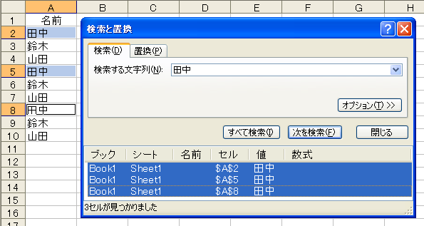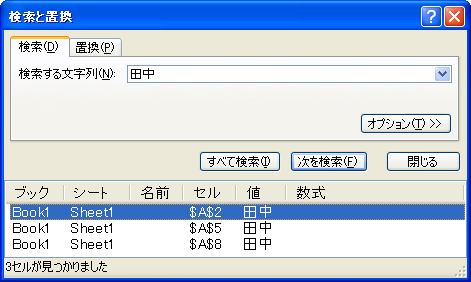 実行すると、検索に該当するすべてのセルがリスト形式で表示されます。