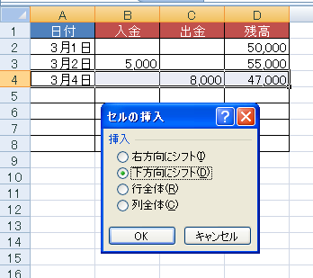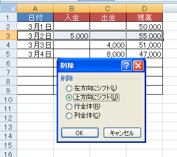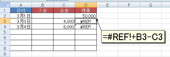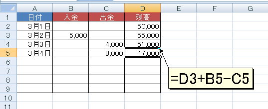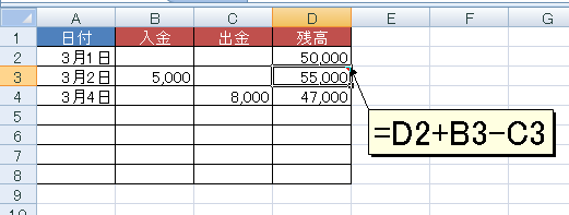 前日の残高に入金を加えて、出金を引いたのが新しい残高です。