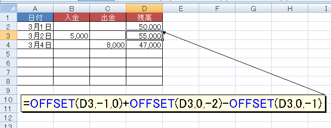 計算式も簡単ですね。よくExcel入門とかで「お小遣い帳を作ってみよう」みたいなネタで登場します。