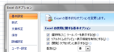 (3)[基本設定]グループの[[開発]タブをリボンに表示する]チェックボックスをオンにします