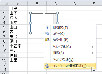 [コントロールの書式設定]をクリックします。