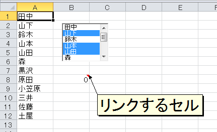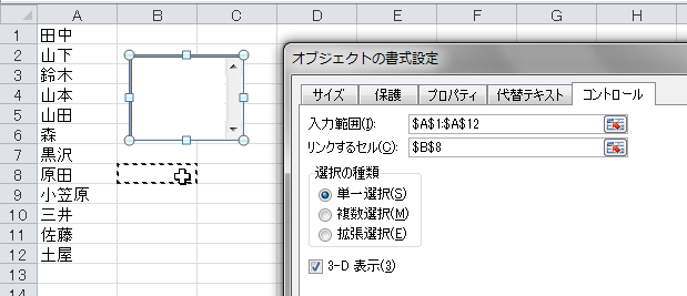 次に、[リンクするセル]ボックス内をクリックして、任意のセルをクリックします。ここでは、セルB8とします。このセルに「リストボックスで何番目のデータが選択されているか」の数値が入力されます。