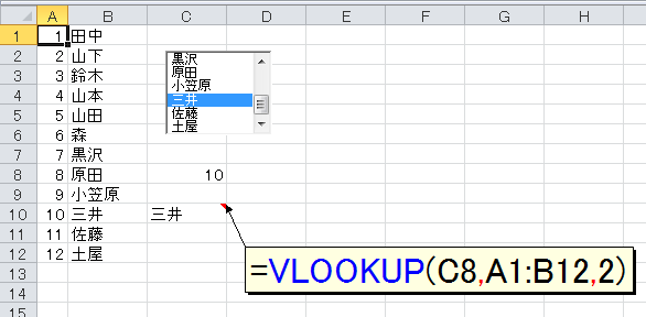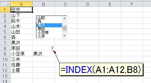 [リンクするセル]で設定したセルには「リストボックスで何番目のデータが選択されているか」を表す数値が入力されます。ここから「どの項目が選択されたか」を調べるには関数を使います。いろいろな方法がありますが、たとえば次のようにINDEX関数で取得できます。
