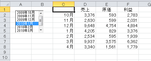 ここからはExcel 2010の画面で解説します。Excel 2003以前のバージョンでも同じです。なお、ここでは、下図のように、リストボックスに表示したいデータがA列に入力されているものとします。