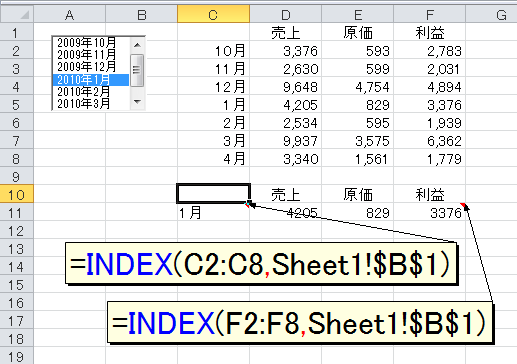 (5)グラフに表示するデータを、リストボックスで切り替えられるようにします。こんなときは、元のデータ(ここでは、セル範囲C1:F8)からではなく、別にグラフ用のデータを生成してやるといいです。元データの下に、下図のような数式を入力します。セルC11に「=INDEX(C2:C8,Sheet1!$B$1)」と入力して、右方向にセルF11までコピーしてください