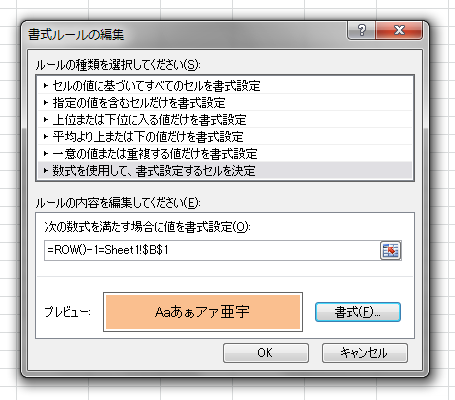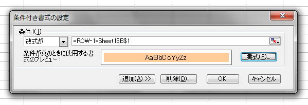 (10)Excel 2003までなら[書式]-[条件付き書式]をクリックして[条件付き書式の設定]ダイアログボックスを開き、「数式が」で「=ROW-1=Sheet1$B$1」と設定します。セルの背景色は適当に決めてください
