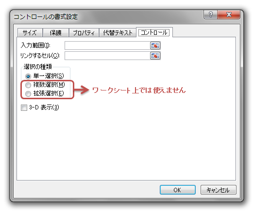 [選択の種類]グループで「単一選択」が選択されているのを確認して、[OK]ボタンをクリックします。なお、ここでは[3-D表示]もオンにしました。