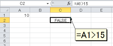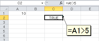 TRUEは、いわば"正しい"という状態です。下図のセルA1には10が入力されています。10は5より大きいです。したがって「A1>5」は正しいのでTRUEを返します。