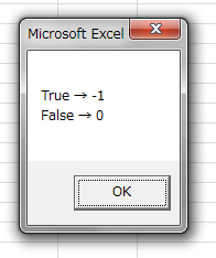 ちなみに、VBAでは少し違います。Falseが0というのは同じですが、Trueは1ではなく-1です。