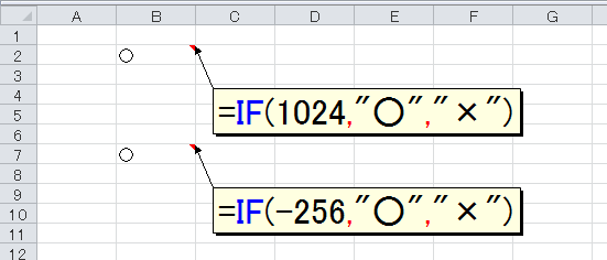 IF関数の条件に「0と1ではない数値」を指定したところ、条件がTRUEのときの式1が計算されました。つまり、1024や-256はTRUEであると認識されたのです。ここから、