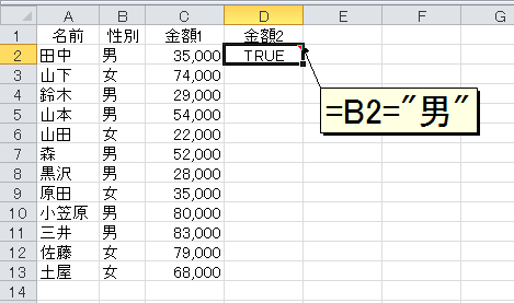 これは「セルB2が"男"である」という意味ですので、それが正しいときはTRUEが返ります。セルD2をセルD13までコピーすると、性別が"男"の行だけTRUEになるのがわかります。