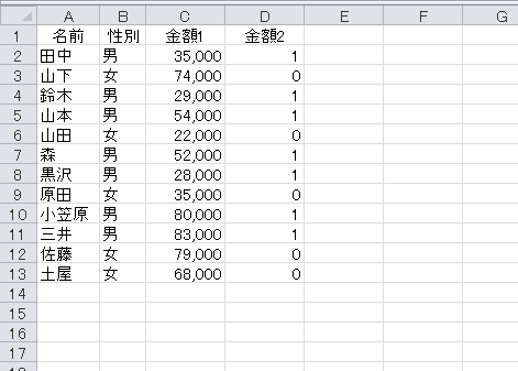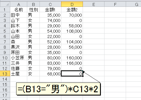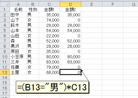 さて、任意の数値に1をかけても数値は変化しませんが、任意の数値に0をかけると0になります。そこで「性別="男"」という論理式の結果と「金額1」の数値をかけ算します。セルD2の数式を「=(B2="男")*C2」として、セルD13までコピーします。