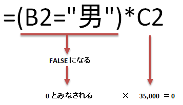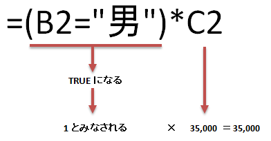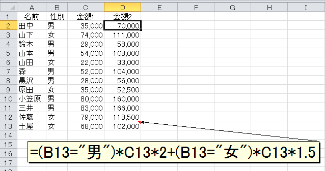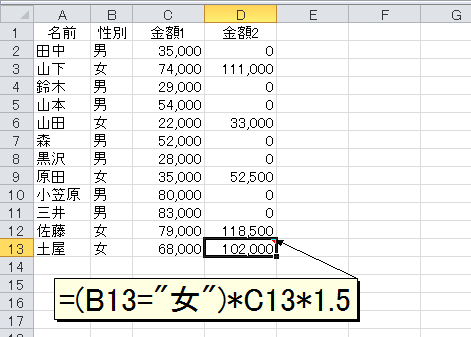 性別が"男"のときは、後半部分の「(B2="女")*C2*1.5」が0となり、性別が"女"なら前半部分の「(B2="男")*C2*2」が0になりますので、IF関数を使ったのと同じ計算結果を得られます。