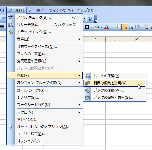 [ツール]-[保護]-[範囲の編集を許可]を実行します