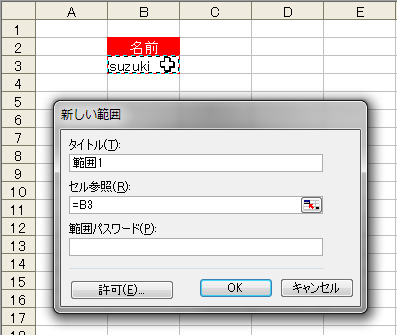 実行すると[新しい範囲]ダイアログボックスが表示されます。[セル参照]ボックスをクリックしてから、入力を許可するセル(ここではセルB3)をクリックします