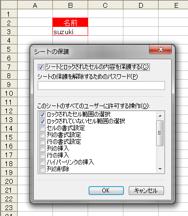 [シートとロックされたセルの内容を保護する] →