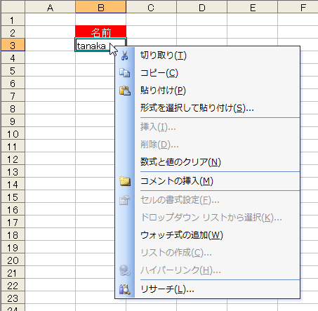 でも、セルB3で[セルの書式設定]は実行できません。