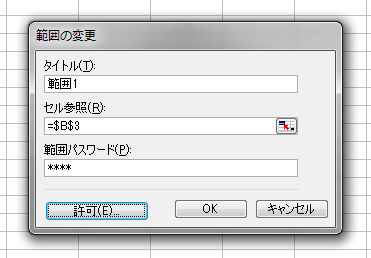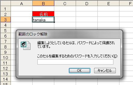 手順4.の[新しい範囲]ダイアログボックスで、[範囲パスワード]を設定すると、セルB3を編集しようとしたとき、設定したパスワードが必要になります。