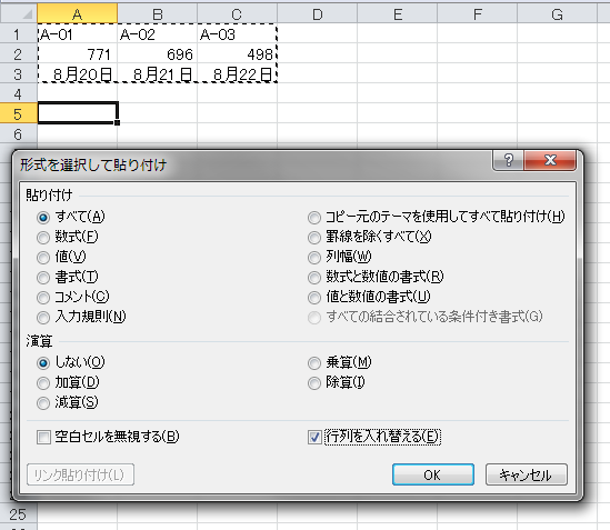- [行列を入れ替える]をオンにして[OK]ボタンをクリックすると、コピーしたセル範囲の行列を入れ替えて貼り付けられます