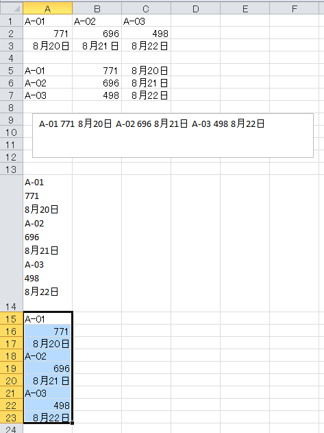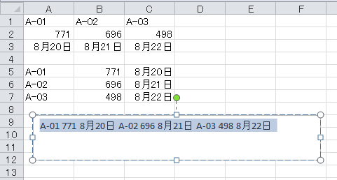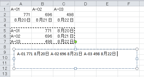 手順が多くて、面倒くさいですね。何とか、Excelの標準機能だけ(関数を除く)で実現しようとしたら、こうなってしまいました。まぁ、できるのは間違いありません。ただし、Excel 2007以降です。Excel 2003までのテキストボックスでは、上記の手順6で貼り付けができません。