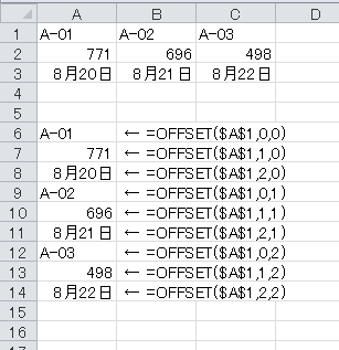 こうした関数を1つずつ入力するのは現実的ではありません。最初の数式を作成して、下方向にコピーすれば、自動的に適切な数式が作成されると便利です。そのためには、OFFSET関数の引数が