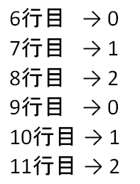 と、自動的に変化しなければなりません。まず、0→1→2の繰り返しを計算で作ってみましょう。