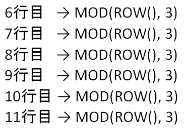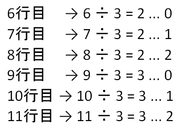 なぜ3で割るのか?とか、最初のセルが6行目じゃなかったら?などは、それほど難しくありませんので、ぜひ自分で考えてください。仕組みが分かれば応用できますし、逆に、仕組みが分からないようなら、実務で応用することはできません。