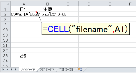 これで、シート名を変更すれば、セルA2の日付も自動的に変わります。