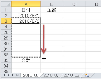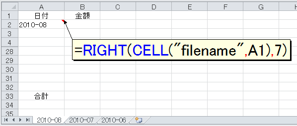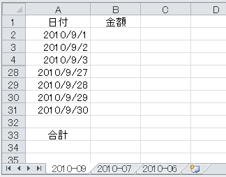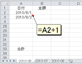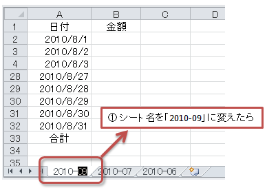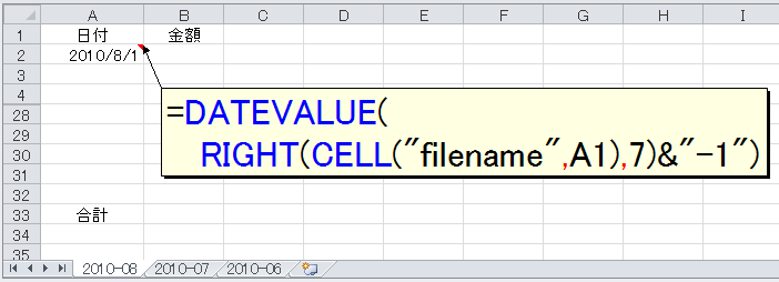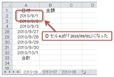 つまり、こういうことでした。前月のシート(たとえば[2010-08])をコピーして今月のシート(たとえば[2010-09])を作ると、セルA2の日付が自動的にその月の1日(たとえば"2010/09/01")にならないかと。