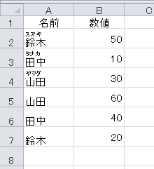 上図のデータは、一部の文字列にフリガナが設定されていません。これを並べ替えると、こうなります。