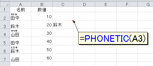 PHONETIC関数は、指定したセルにフリガナが設定されていない場合、セルに入力されている文字列(ここでは"鈴木")を返します。だから、PHONETIC関数の結果が